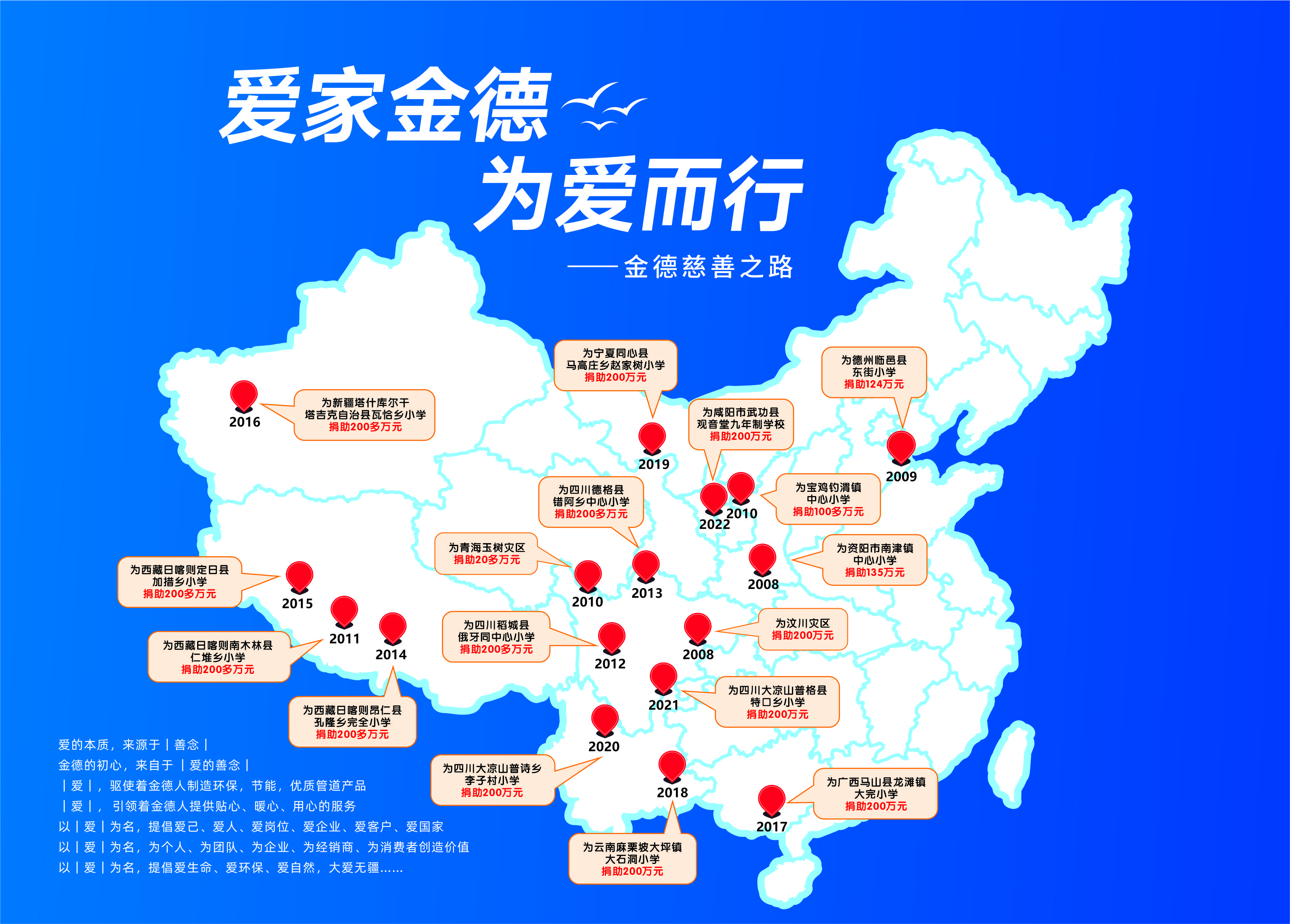 為了銘記汶川地震,也為了幫助更多貧困地區(qū)的孩子們得到更好的教育,金德管業(yè)集團(tuán)把每年的五月份定為企業(yè)的慈善月。每年五月,金德管業(yè)集團(tuán)全體員工和廣大經(jīng)銷商朋友都會(huì)慷慨解囊,捐助一所希望小學(xué),期間金德人做慈善的腳步從未中斷過(guò)。